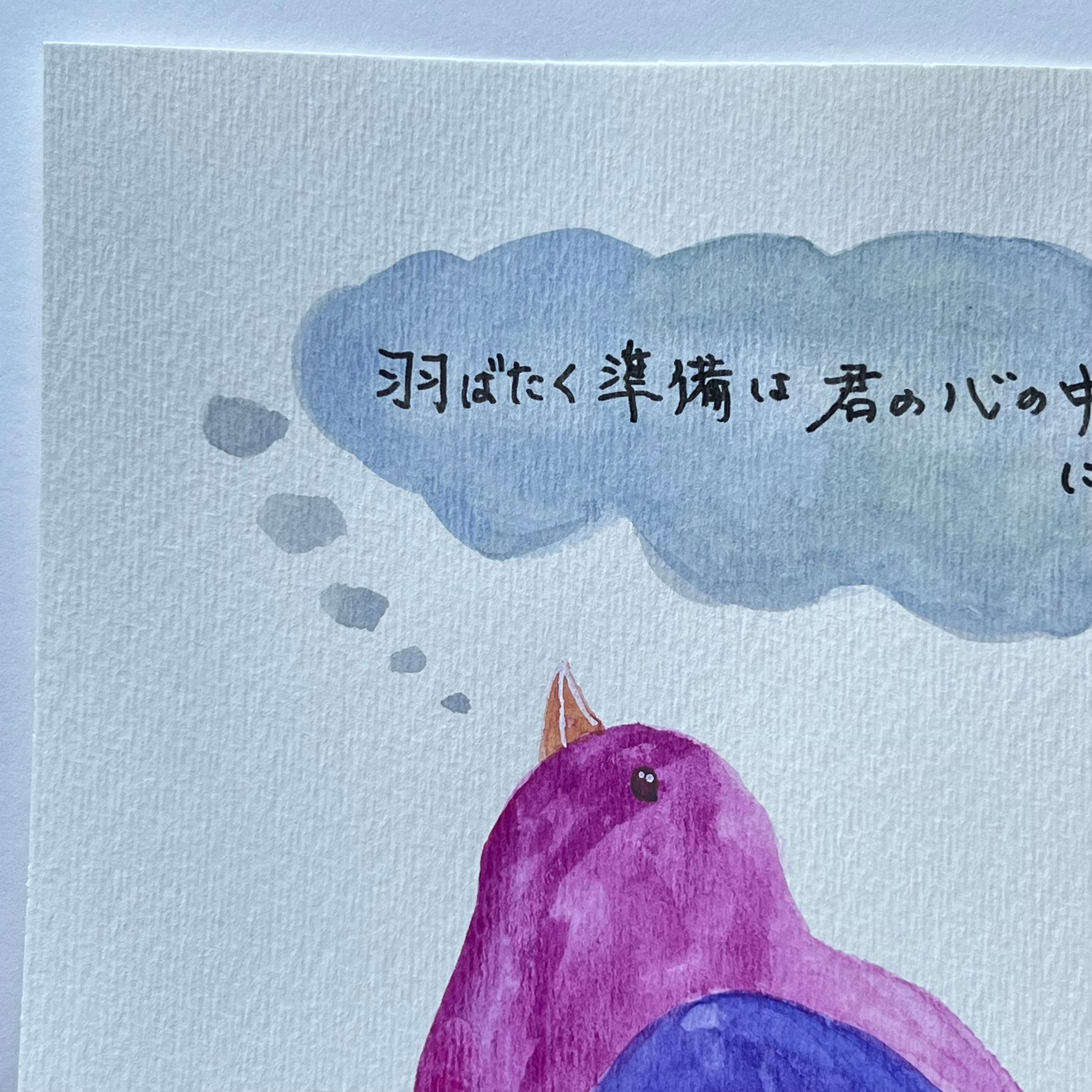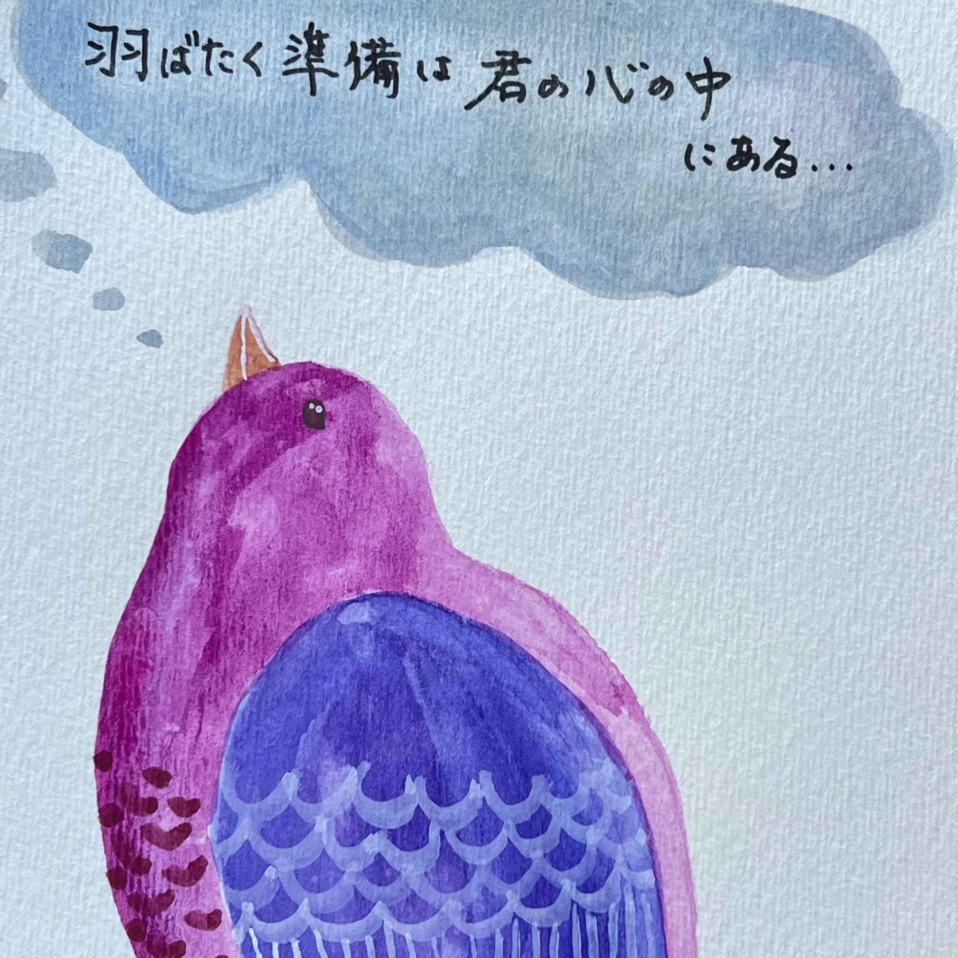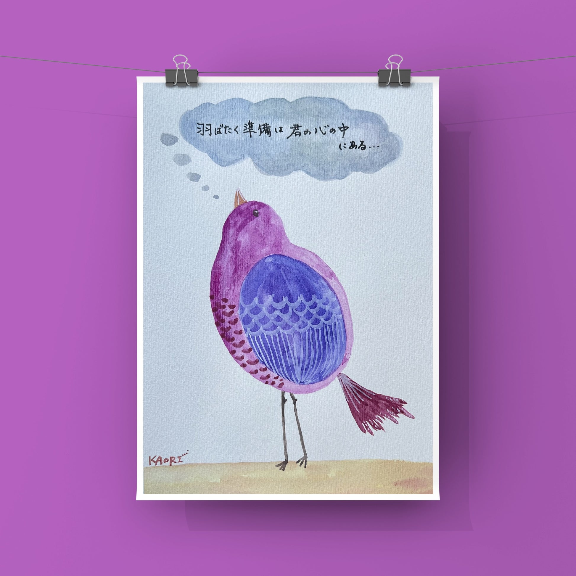 鮮やかな紫の鳥が空を見つめ、あなたの心の奥に眠る勇気をそっと思い出させてくれます。